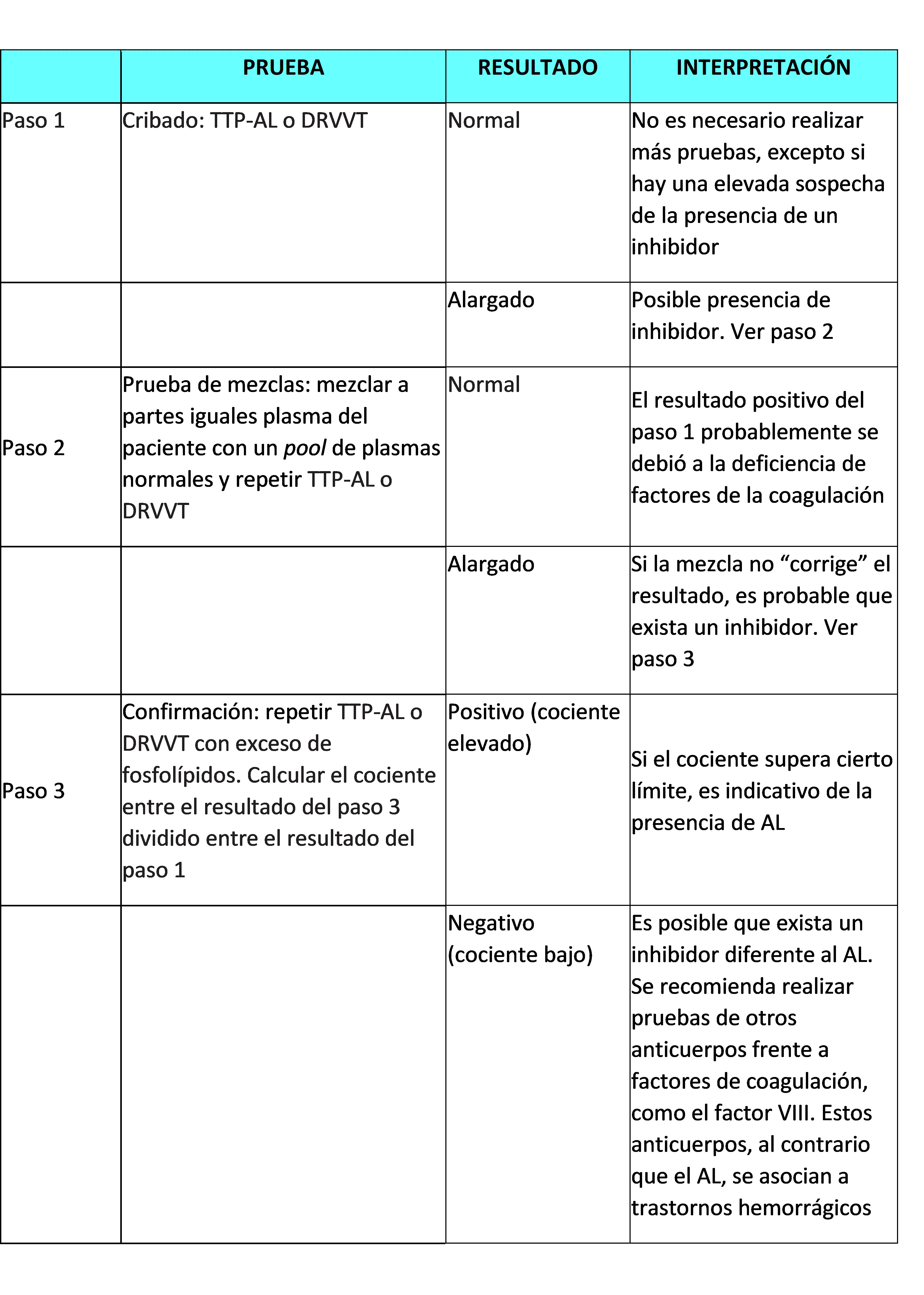 - Prueba de cribado: se recomienda emplear dos pruebas para detectar el AL. Las más sensibles son la prueba de Russell diluida (DRVVT) y la prueba del TTP sensible a AL (TTP-AL) que emplea reactivos con poca cantidad de fosfolípidos. Posteriormente, deben realizarse otras pruebas adicionales para confirmar o excluir la presencia de AL.