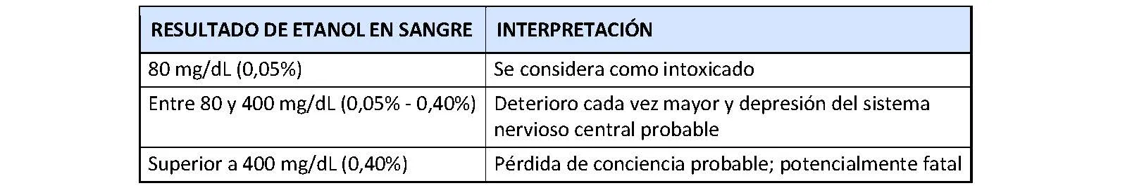 El etanol para fines médicos suele solicitarse cuando un individuo presenta signos o síntomas de intoxicación etílica, como: