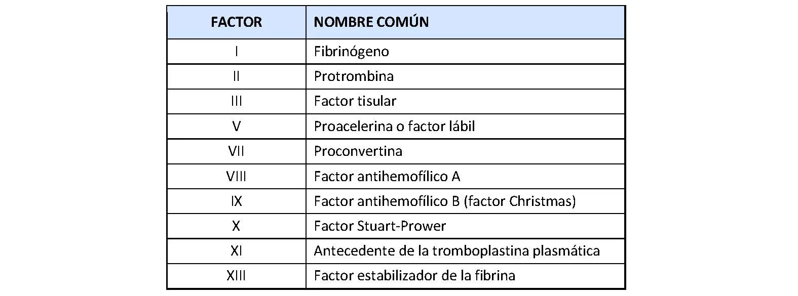 Existen nueve factores proteicos de la coagulación que se analizan de manera rutinaria (se describen en la siguiente tabla). A estos factores se les asigna un número romano y, en ocasiones, también un nombre. Por ejemplo, el factor II de la coagulación, también es conocido como protrombina. Cuando faltan uno o varios de estos factores, se producen en poca cantidad, o no funcionan adecuadamente, puede aparecer un sangrado excesivo.
