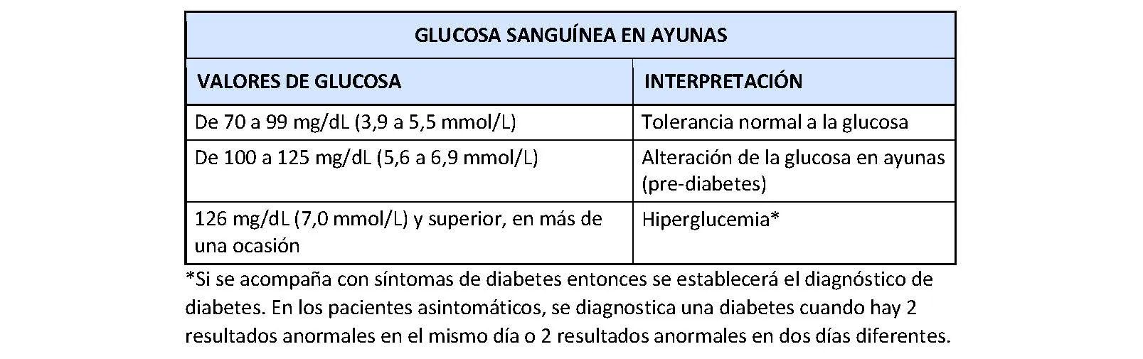 En el caso de la glucosa sanguínea en ayunas, los criterios son los siguientes, basándose en las recomendaciones de práctica clínica de la American Diabetes Association (ADA).