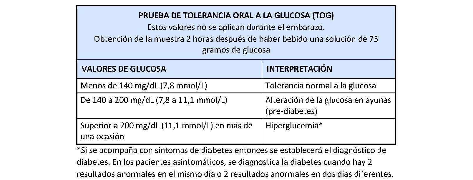 A continuación se resume el significado de los resultados obtenidos con la prueba de tolerancia oral a la glucosa (TOG). Estos valores no son aplicables en mujeres embarazadas.