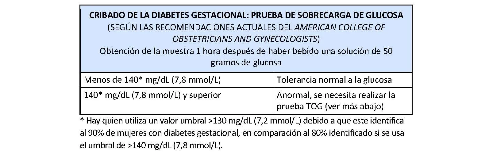En el caso de la diabetes gestacional, normalmente se realiza un cribado en las mujeres embarazadas entre las semanas 24 y 48 de gestación, especialmente si presentan síntomas o han tenido ya una diabetes gestacional previa. Así, se puede realizar una prueba de sobrecarga oral de glucosa (SOG) o un test de O’Sullivan. En el caso de presentar unos valores de glucosa en sangre superiores a 140 mg/dL, será necesario realizar una prueba de tolerancia oral a la glucosa (TOG) para confirmar el diagnóstico de diabetes gestacional.