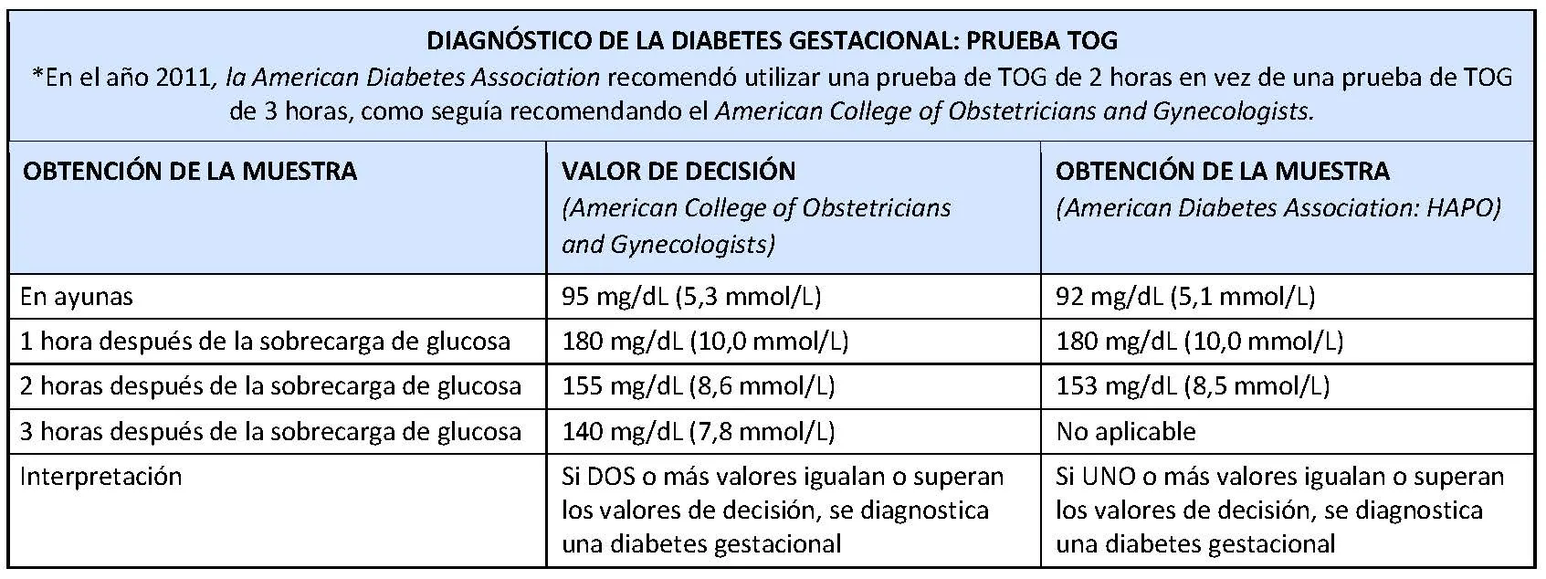 Los valores umbrales para cada punto temporal difieren según la cantidad de glucosa administrada inicialmente y los criterios utilizados. Los criterios del ensayo Hyperglycemia and Adverse Pregnancy Outcome (HAPO), son más rigurosos y se empezaron a recomendar en el año 2011.