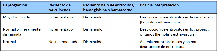 La siguiente tabla resume la posible interpretación de los resultados de la haptoglobina.