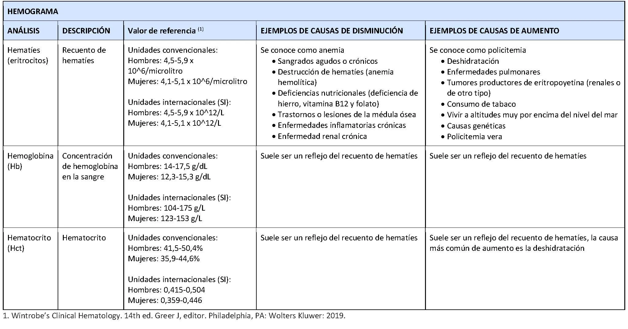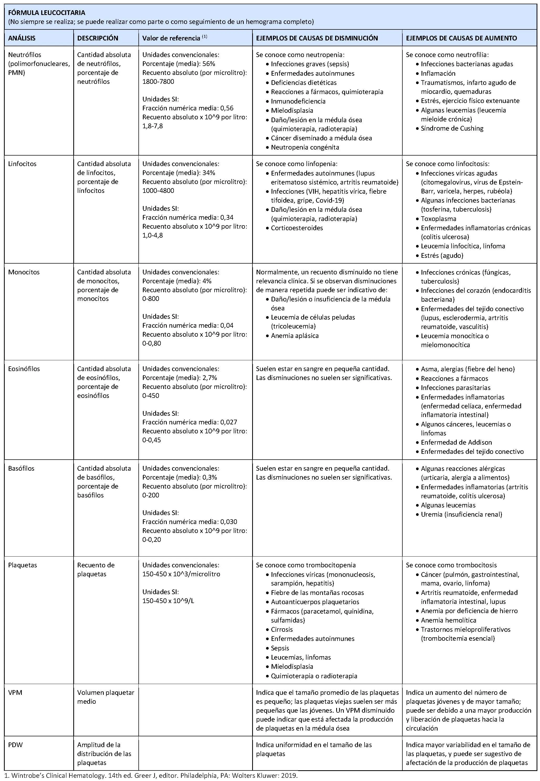 Para obtener detalles adicionales, consultar las tablas en la sección titulada detalles sobre los resultados del hemograma, en las que se explica brevemente y de manera general lo que puede significar el resultado para cada componente del hemograma.