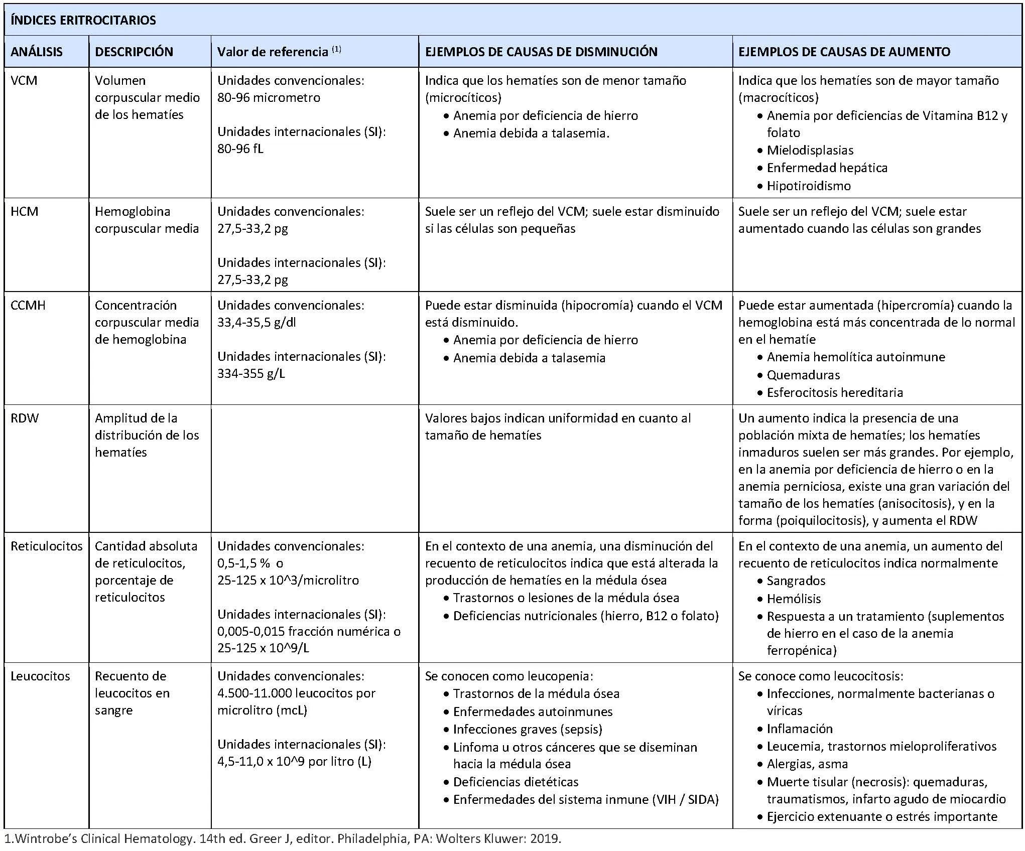 - Índices de la serie roja: son cálculos que proporcionan información acerca de algunas características físicas de los hematíes. Volumen corpuscular medio (VCM): es una medida del tamaño promedio de los hematíes. Hemoglobina corpuscular media (HCM): es una medida calculada de la cantidad promedio de hemoglobina dentro de los glóbulos rojos. Concentración corpuscular media de hemoglobina (CCMH): es una medida calculada de la concentración promedio de hemoglobina dentro de los glóbulos rojos. Amplitud de distribución de hematíes (RDW): es una medida de la variación en el tamaño de los glóbulos rojos.