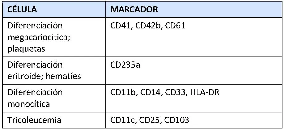 Los marcadores presentes en las células y detectados por inmunofenotipado contribuyen a caracterizar las células anómalas. Una célula normal mostrará un patrón de antígenos que se correlaciona con el tipo y madurez de la célula. En general, las células sanguíneas maduran en la médula ósea y se liberan a la circulación cuando están maduras o casi maduras.