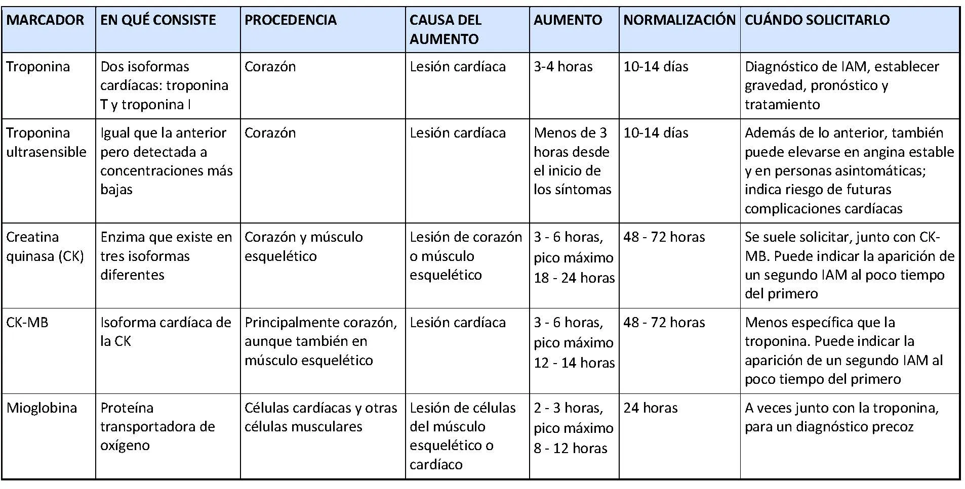 - Troponina (I o T): constituye la prueba más solicitada, al ser el marcador cardiaco más específico. Se eleva a las pocas horas del daño cardíaco y se mantiene elevada durante unas dos semanas. Un incremento progresivo de la concentración de troponina en determinaciones seriadas puede resultar muy útil para diagnosticar un IAM.