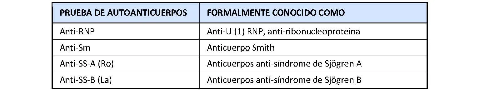 También conocido como: anticuerpos contra antígenos extraídos de solución salina, anti-RNP, anti-ribonucleoproteína, anti-U (1) RNP, anti-SmRNP, SSA (Ro), anti-síndrome de Sjögren A (Anti-SSA), SSB (La), anti-síndrome de Sjögren B (Anti-SSB), anti-Sm (Sm), anticuerpo Smith, Scl-70, anti-topoisomerasa 1, anticuerpos de la esclerodermia, anti-Jo-1, anticuerpos antihistidil t-ARN sintetasa, aerfil ENA