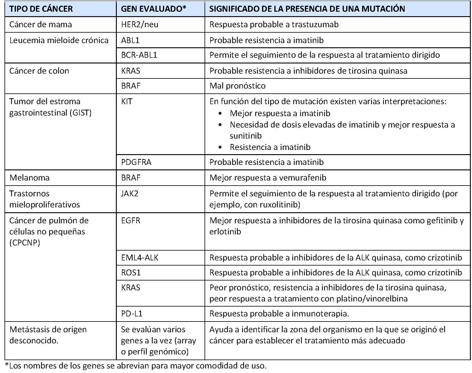 En la tabla siguiente se describen algunos tipos de cáncer en los que pueden emplearse pruebas genéticas con la finalidad de tomar decisiones acerca del tratamiento frente a dianas específicas.