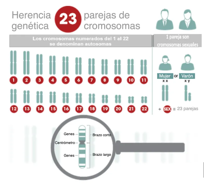 Se denomina genoma a toda la información genética de un individuo. El genoma es el conjunto completo de ADN que se encuentra localizado en una célula y está organizado en cromosomas. Cada célula humana tiene 23 pares de cromosomas, la mitad de cada par se hereda de la madre y la otra mitad del padre.