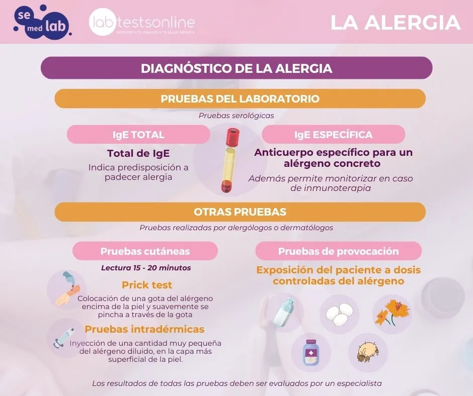 - IgE total: a veces se solicita para evaluar cómo evoluciona un proceso alérgico. La prueba detecta la presencia de proteína de tipo IgE, incluyendo a los anticuerpos propios de la alergia, aunque no permite identificar los alérgenos específicos. Las concentraciones de IgE total pueden estar aumentadas por otros motivos distintos de una alergia.