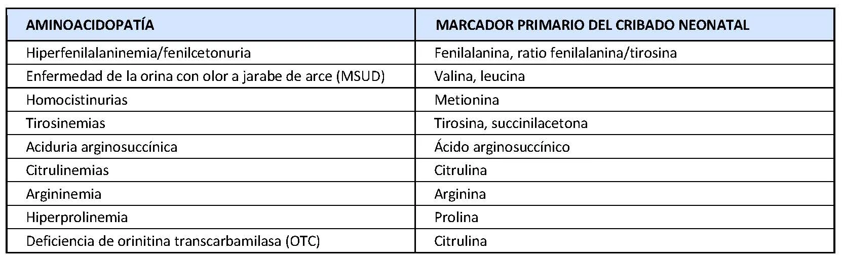 En la siguiente tabla se resumen la aminoacidopatía y su marcador primario