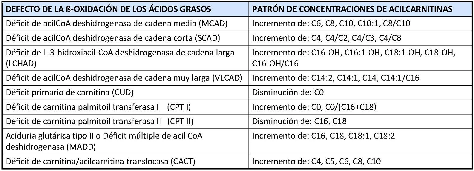 Con el objetivo de detectar de forma precoz los defectos congénitos de la ß-oxidación de los ácidos grasos, se determina mediante espectrometría de masas la concentración de diferentes acilcarnitinas (intermediarios en el transporte de ácidos grasos hacia la mitocondria para su degradación) en la muestra de sangre seca recogida sobre el papel de filtro a partir de una pequeña incisión en el talón del recién nacido. Cada uno de los defectos de la ß-OAG presenta un patrón característico de estas acilcarnitinas. En la siguiente tabla se recogen los patrones de diagnóstico de los diferentes defectos de la ß-OAG.