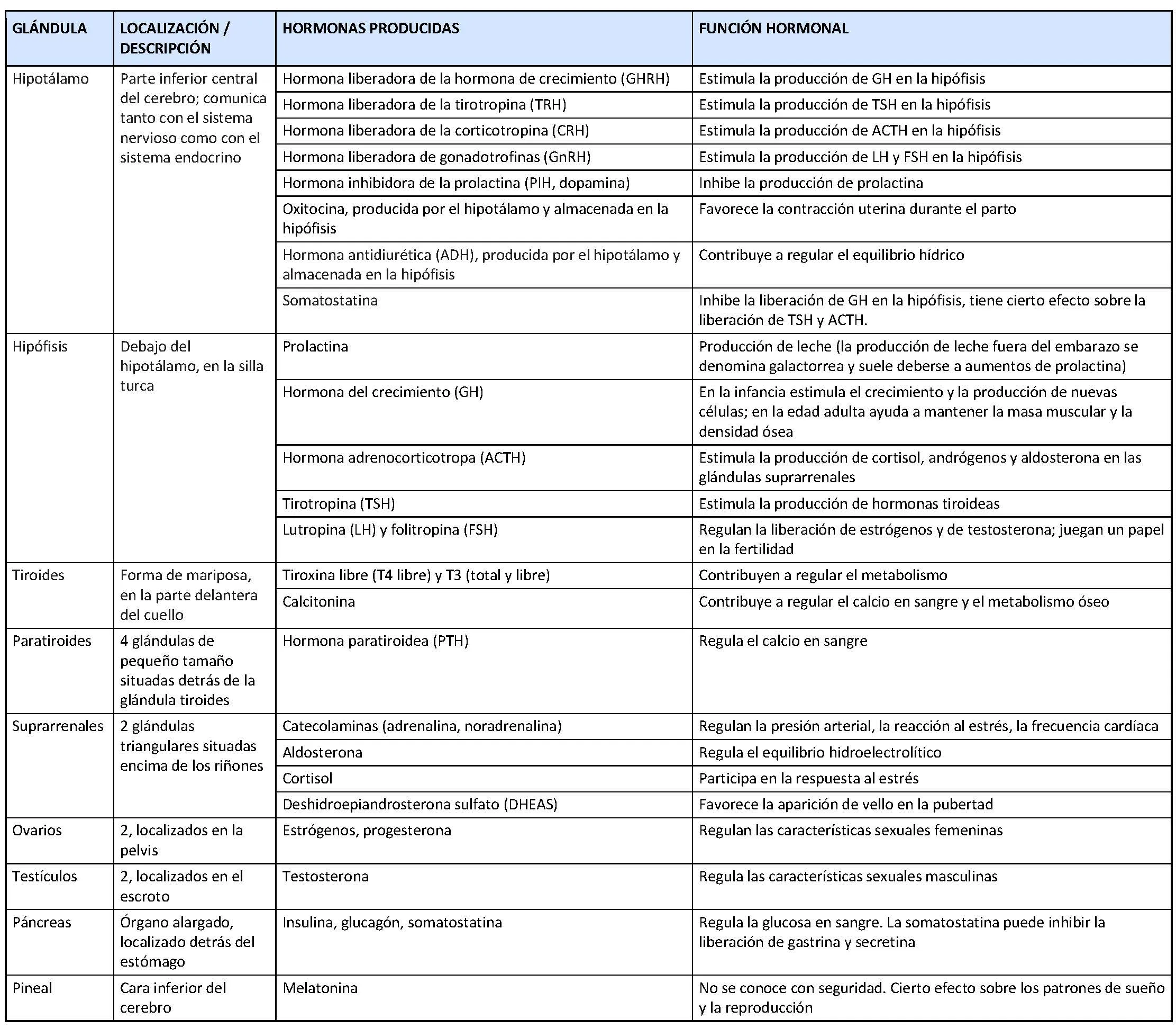 En esta tabla resumen se incluye un listado de glándulas endocrinas, junto con las hormonas que producen y la acción que ejercen.