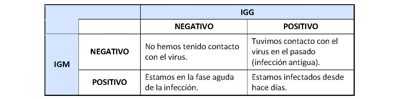 - Un resultado positivo de esta prueba indicaría que la persona ha estado expuesta al virus, pero no necesariamente que esté infectado. Para poder saber si aún está infectado con el virus o ya se ha curado habría que distinguir el tipo de inmunoglobulina, IgM o IgG, e interpretar los resultados conjuntamente de acuerdo al siguiente esquema: