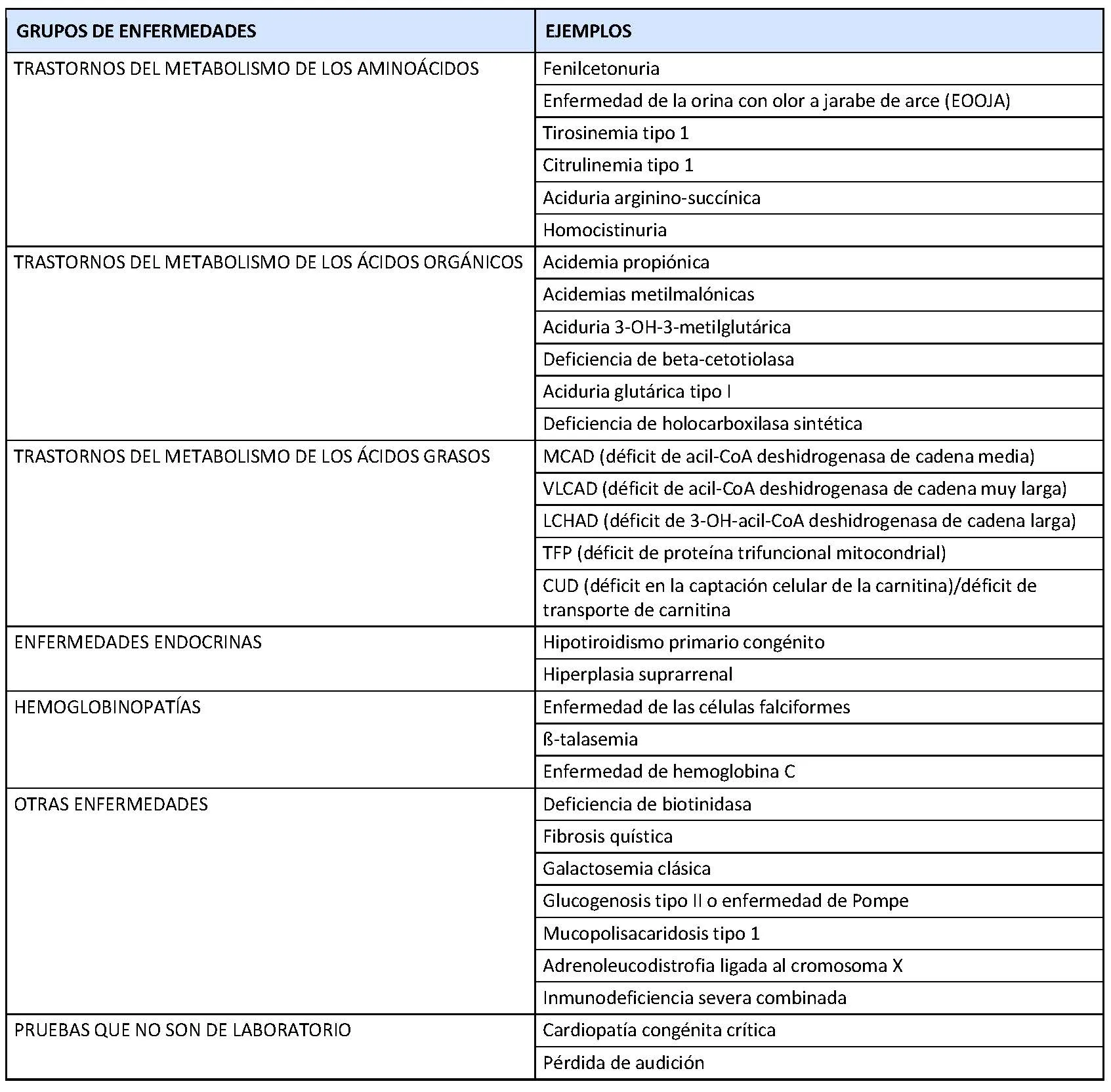 En el siguiente apartado se recogen en una tabla los distintos trastornos que pueden incluirse en los programas de cribado neonatal, aunque no todos ellos se incluyen actualmente en España.