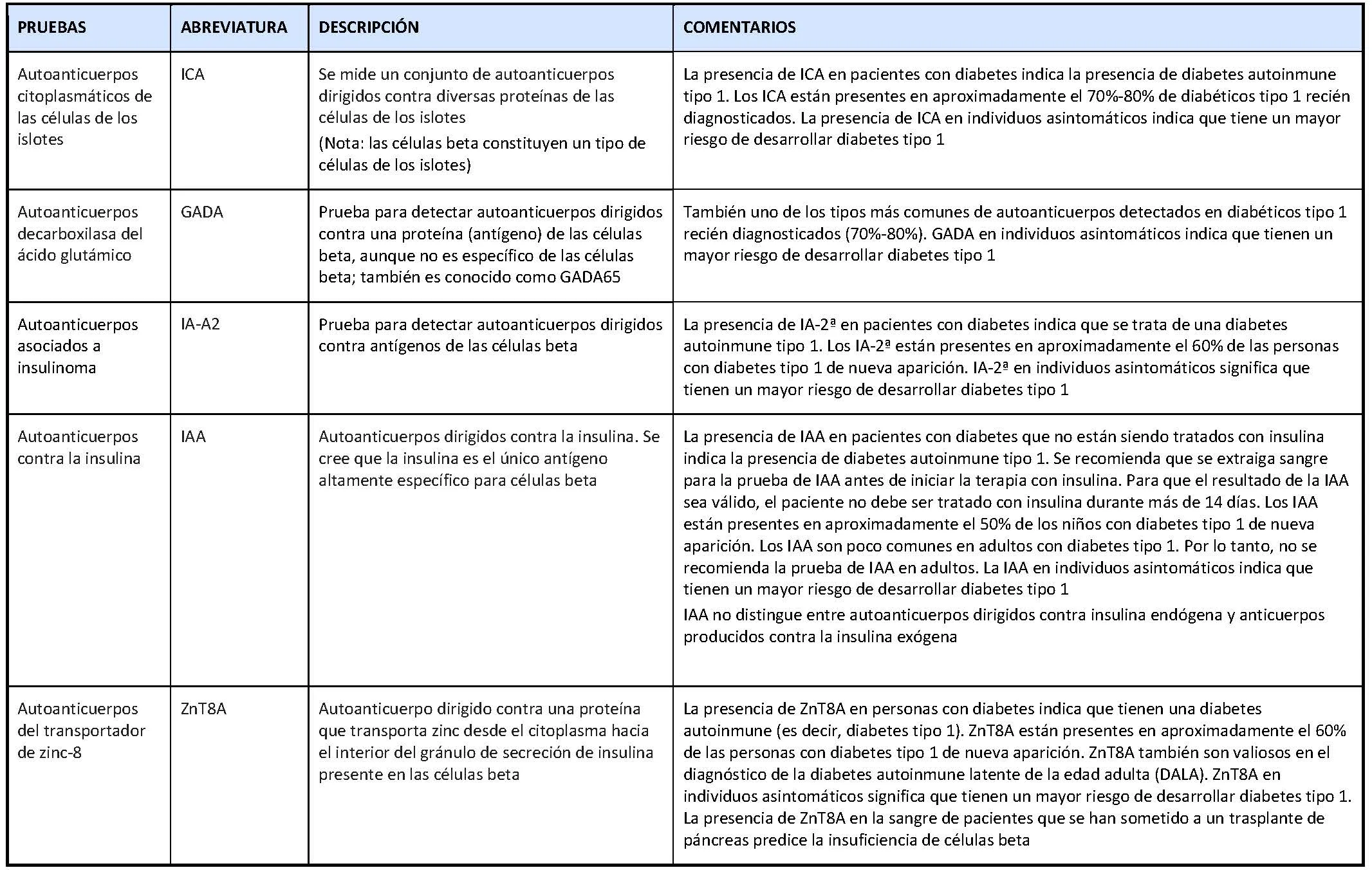 En la tabla siguiente se resumen las características de los cuatro tipos principales de autoanticuerpos relacionados con la diabetes, que son útiles para distinguir entre diabetes tipo 1 y diabetes debida a otras causas.