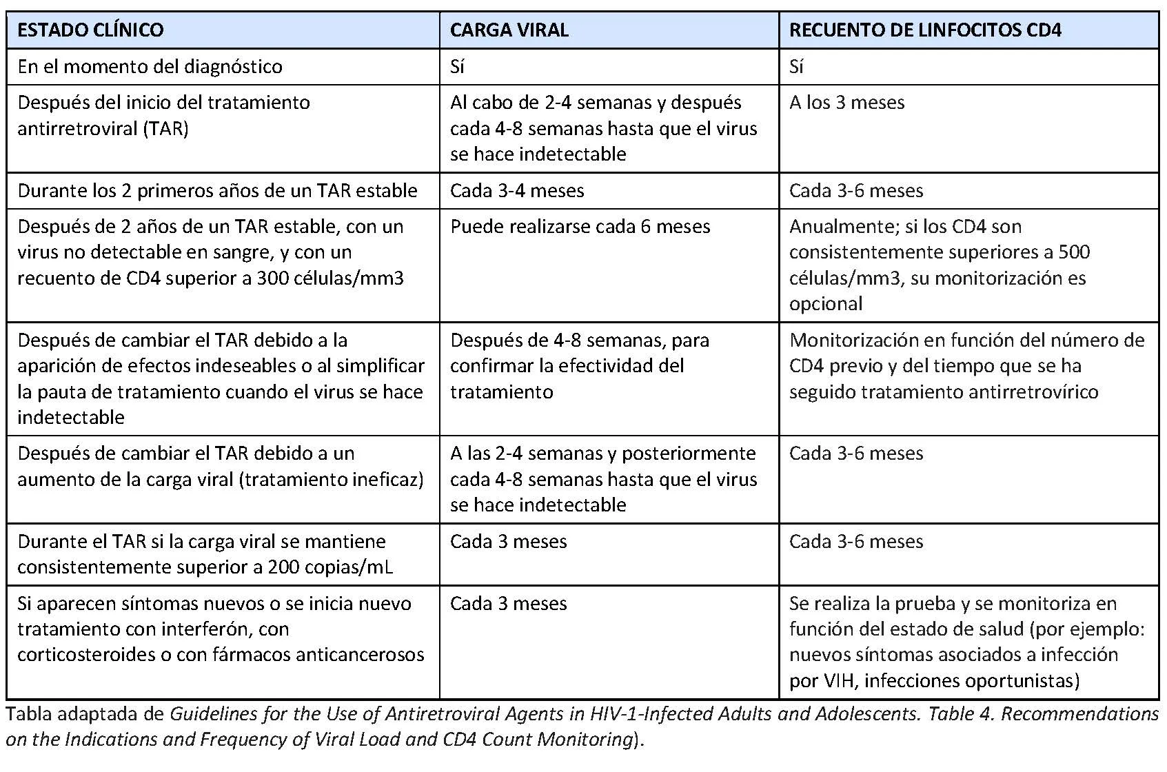 En la tabla siguiente se resumen las recomendaciones referentes a la pauta de solicitud de la carga viral y del recuento de linfocitos CD4.