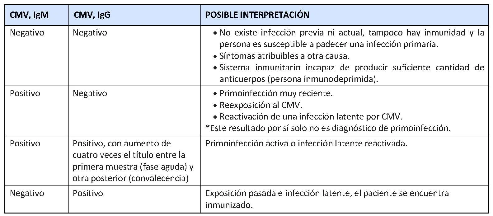 Si un individuo sintomático presenta IgM e IgG frente a CMV, es probable que se trate de una primoinfección o bien que una infección previa se haya reactivado. Esto puede confirmarse determinando los anticuerpos IgG dos o tres semanas más tarde, para comprobar que van aumentando de manera progresiva. Si entre la primera y la segunda determinación existe un aumento de 4 veces el título de anticuerpos IgG, el individuo tiene una infección activa por CMV (primoinfección o reactivación).