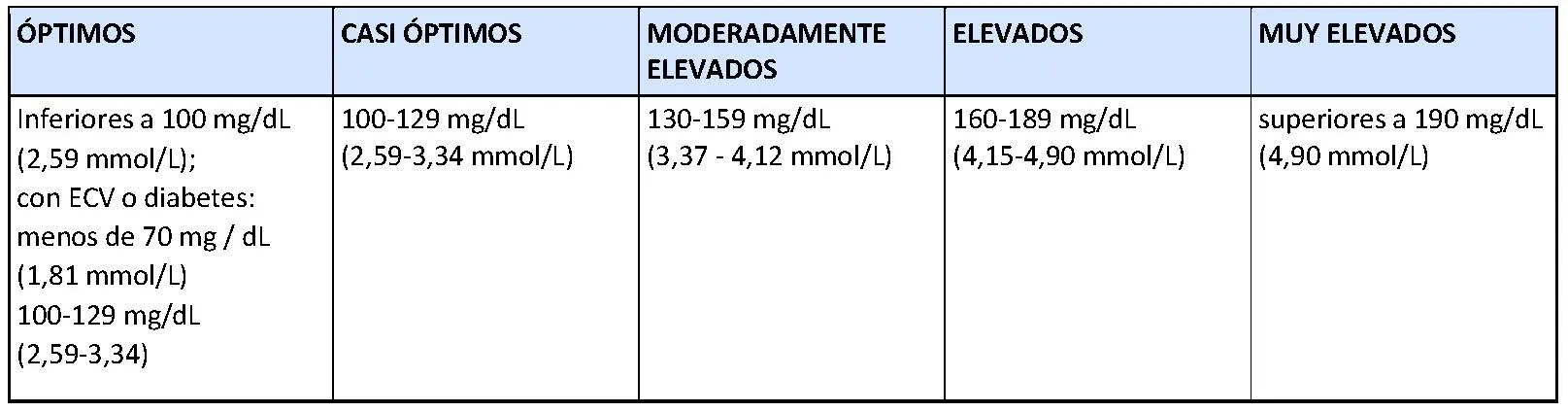 *Algunos organismos recomiendan que la concentración de colesterol LDL sea inferior a 70 mg/dL (1,82 mmol/L) en el caso de que la persona padezca una enfermedad cardiaca o haya sufrido un infarto agudo de miocardio.