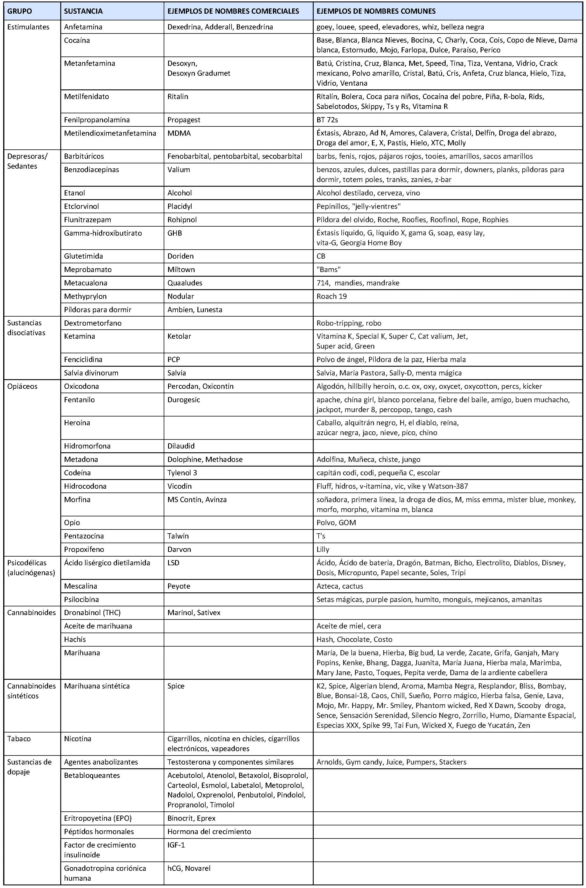 Para más detalles sobre las clases de drogas de abuso, consultar la tabla al final de este artículo.