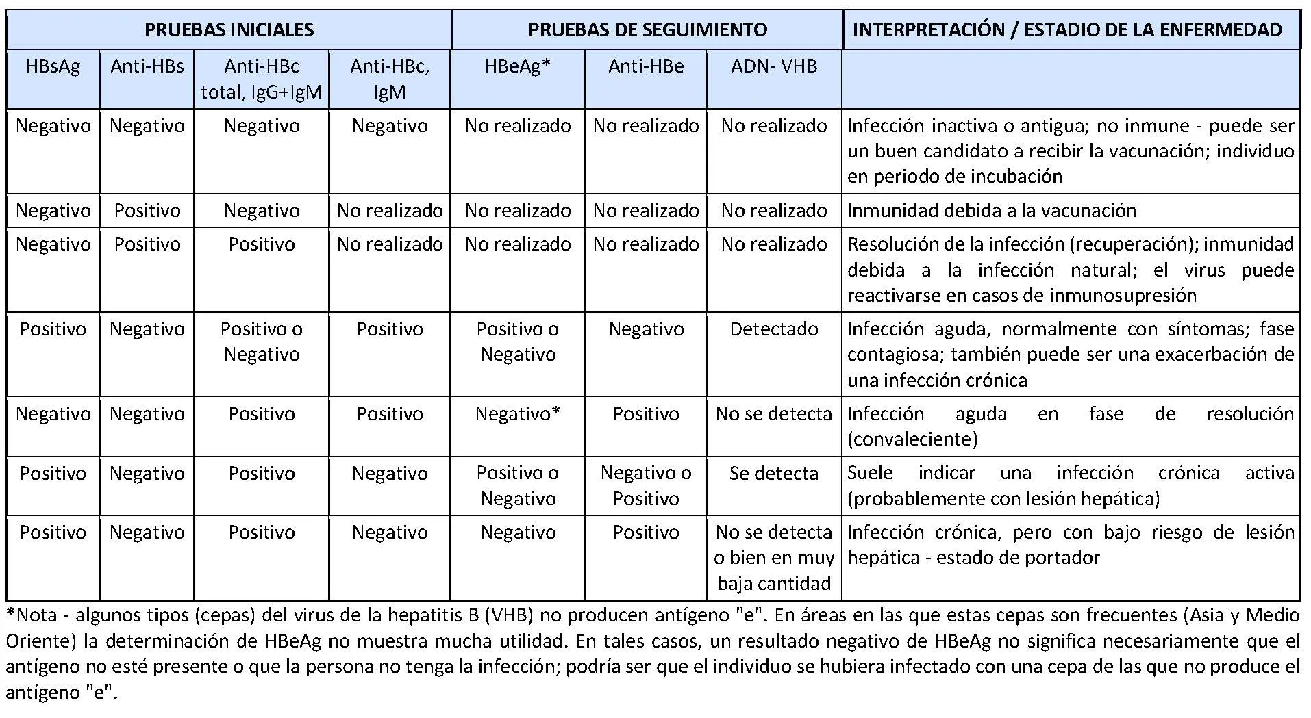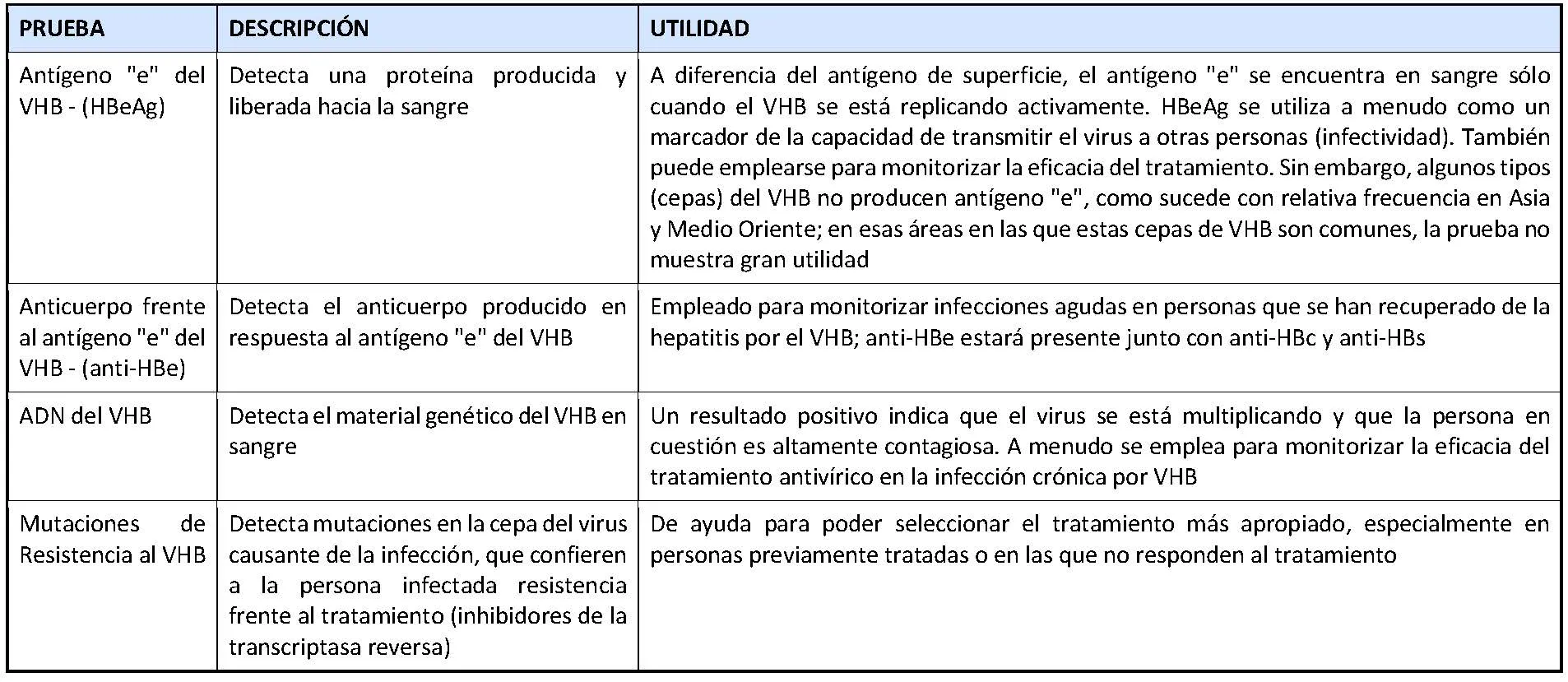En la tabla siguiente se resumen las distintas pruebas de seguimiento que se pueden realizar después de que las pruebas iniciales detecten una infección por VHB.