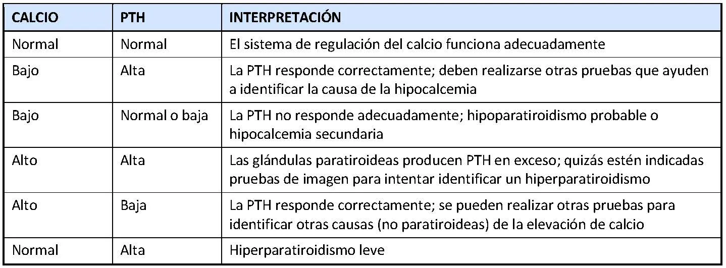 El médico examinará la relación existente entre los valores de PTH y calcio, y evaluará si este equilibrio es el adecuado. Si las concentraciones de PTH y las de calcio son normales, es probable que el sistema de regulación del calcio funcione correctamente.
