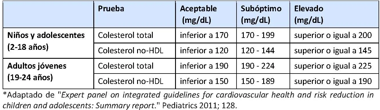 Los niños, adolescentes y adultos jóvenes (entre 2 y 24 años) sin factores de riesgo se deben realizar un perfil lipídico al menos una vez entre los 9 y 11 años de edad, y otra entre los 17 y 21 años.