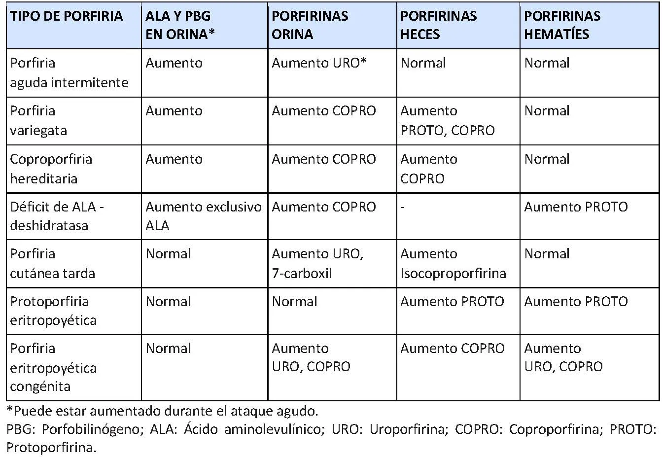- ALA: es también un precursor de las porfirinas; útil para diagnosticar la porfiria por déficit de ALA deshidratasa, aunque este tipo de porfiria es muy poco frecuente. El ALA también puede evaluarse junto al PBG ya que suele estar aumentado en los cuatro tipos de porfirias neurológicas.