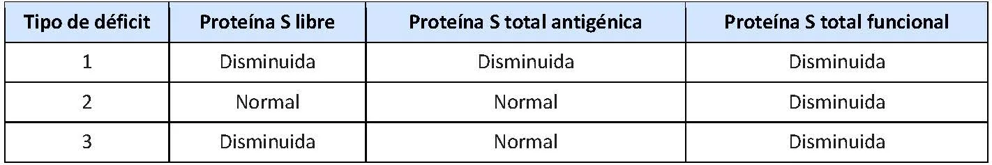 Existen tres tipos de déficit de proteína S asociados a estados de heterocigosis para proteína S. Las personas heterocigotas para el déficit de proteína S presentan un riesgo 10 veces mayor que las personas normales de desarrollar un TEV. En la tabla siguiente se resumen los resultados hallados en cada una de las deficiencias. Los tipos más frecuentes son el 1 y el 3.