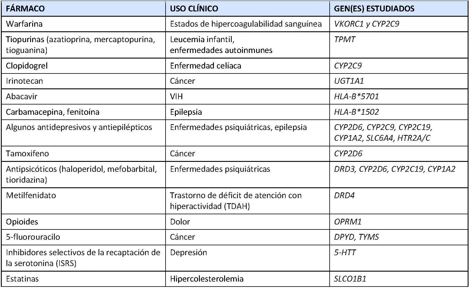 Actualmente existen diversas pruebas farmacogenéticas que pueden solicitarse. A continuación se muestran algunos fármacos para los cuales se dispone de pruebas farmacogenéticas.