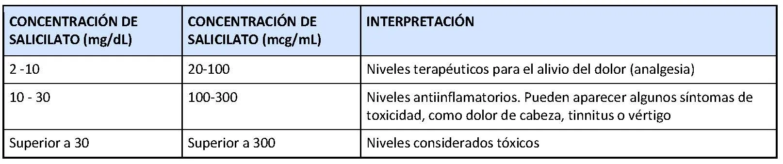 Cuando se detecta una intoxicación aguda por salicilatos, su concentración en sangre debe medirse a intervalos de 2-3 horas para controlar la resolución de la intoxicación. Estas determinaciones seriadas se deben mantener hasta que dos resultados consecutivos muestren un descenso por debajo del nivel pico. Los signos y síntomas de la intoxicación también deben vigilarse.