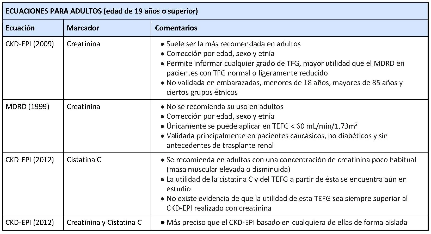 Existen diferentes ecuaciones para estimar la TFG. Las dos ecuaciones más ampliamente utilizadas para estimarla y recomendadas por la National Kidney Foundation (NKF), la Sociedad Española de Nefrología (SEN) y la Sociedad Española de Medicina de Laboratorio (SEQCML) son las siguientes: