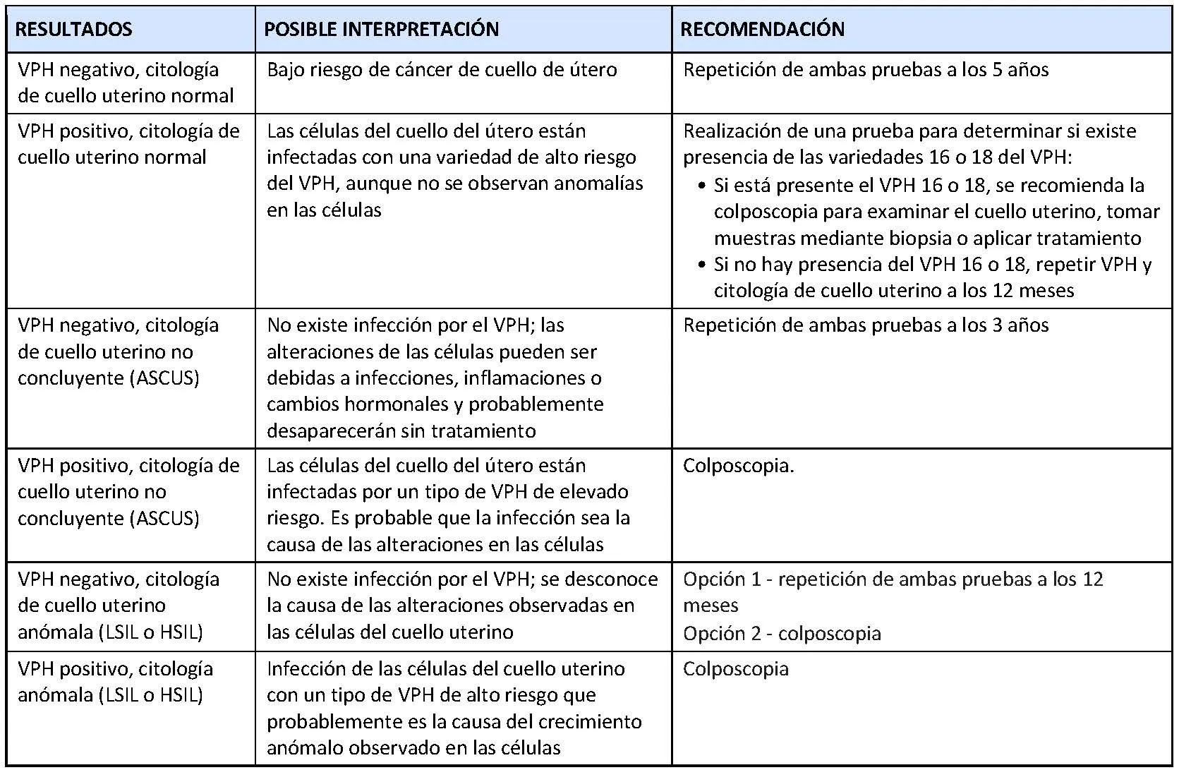 La tabla siguiente es un resumen de los resultados más frecuentes y su interpretación. Es importante recordar que la realización simultánea de ambas pruebas (VPH y citología de cuello uterino) está recomendada en las mujeres cuyas edades están comprendidas entre los 35 y 65 años de edad.