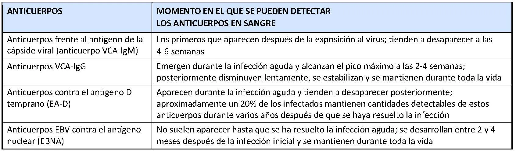 Se encuentran disponibles varias pruebas para diferentes tipos y clases de anticuerpos contra el VEB. Los anticuerpos son proteínas producidas por el cuerpo en una respuesta inmune a varios antígenos diferentes del virus de Epstein-Barr. Durante una infección primaria por el VEB, el nivel de cada uno de estos anticuerpos contra el virus aumenta y disminuye en varios momentos a medida que avanza la infección. La medición de estos anticuerpos en la sangre puede ayudar en el diagnóstico y, por lo general, proporciona al médico información sobre la etapa de la infección y si se trata de una infección actual, reciente o pasada.